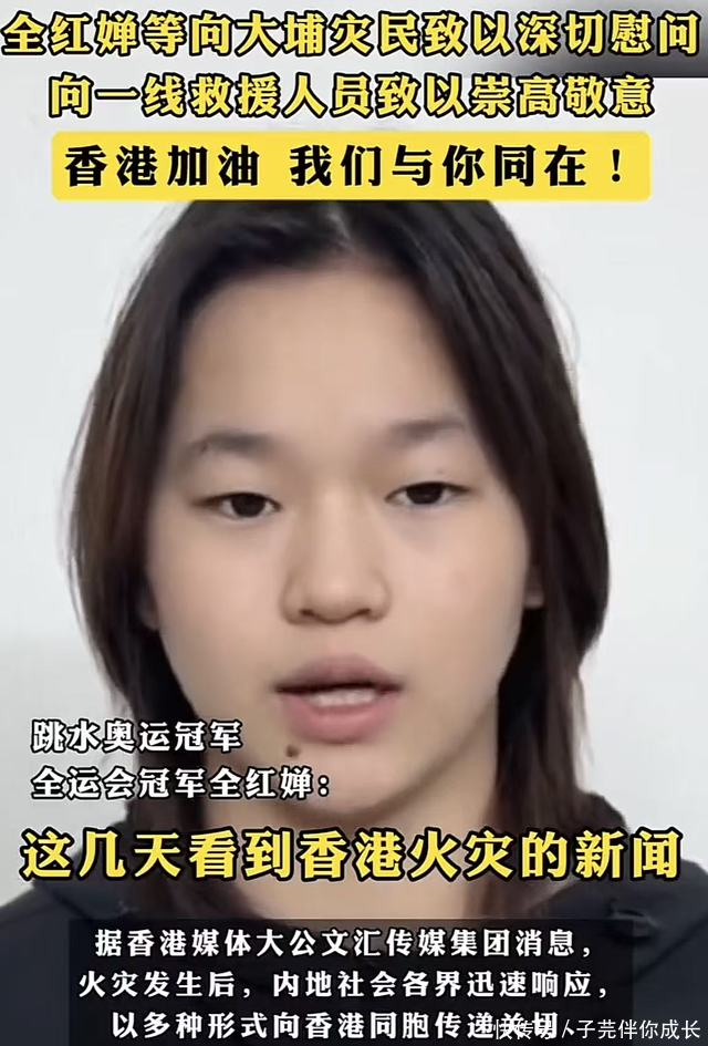 香港大火后,全红婵喊话香港网友,我与你们同在。